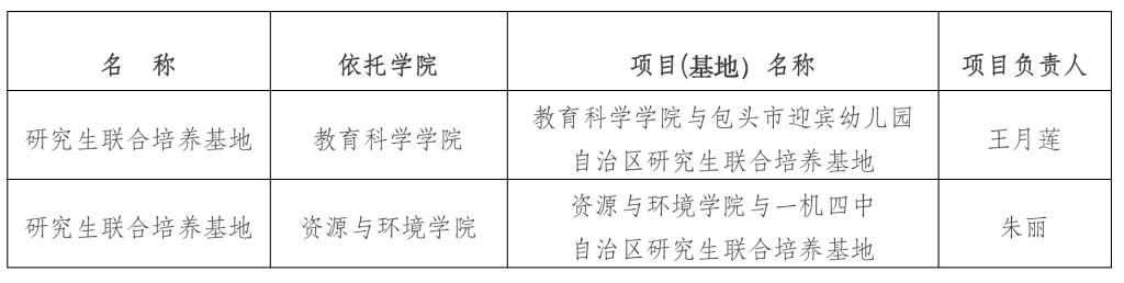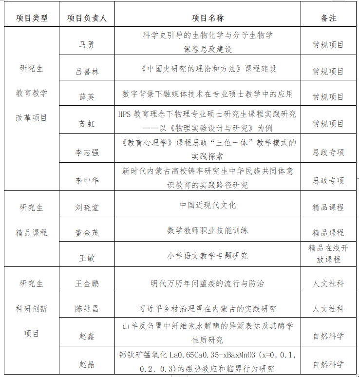按照《关于内蒙古自治区教育厅关于开展2023年研究生教育项目申报等工作的通知》(内教研函[2023]3号)要求,我校严格按照《内蒙古自治区研究生教育教学改革项目管理办法(试行)》《内蒙古自治区研究生科研创新项目管理办法(试行)》《内蒙古自治区研究生联合培养基地建设管理办法(试行)》《内蒙古自治区研究生精品课程建设项目管理办法(试行)》的相关规定,经二级学院审核,学校初评,拟推荐研究生教育教学改革项目6项,研究生科研创新项目4项,研究生精品课程3项,自治区研究生联合培养基地2个,特此公示。