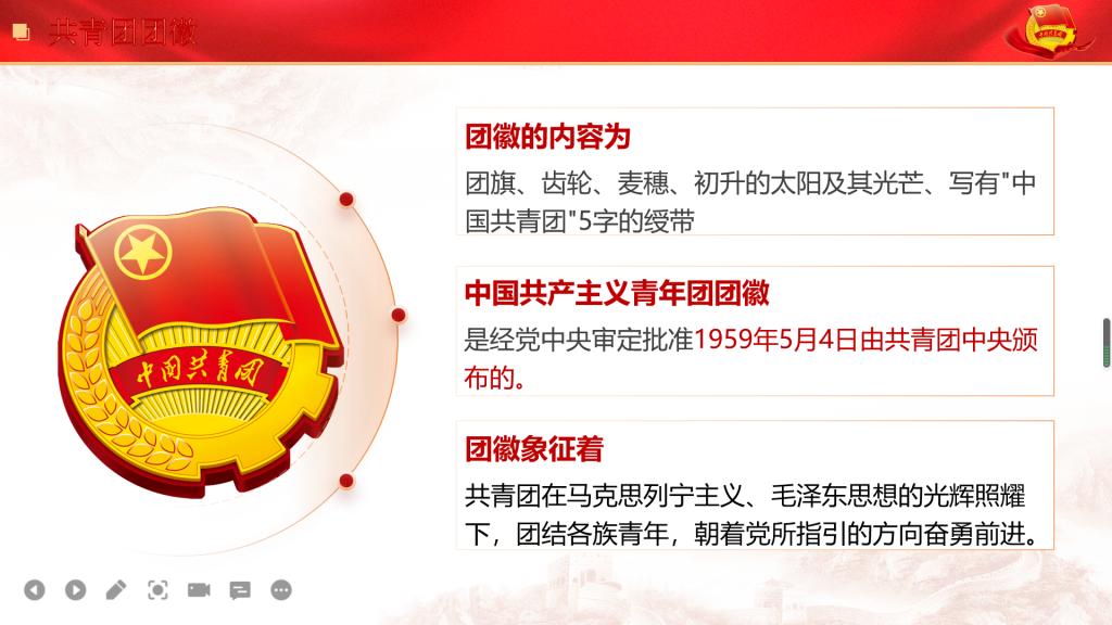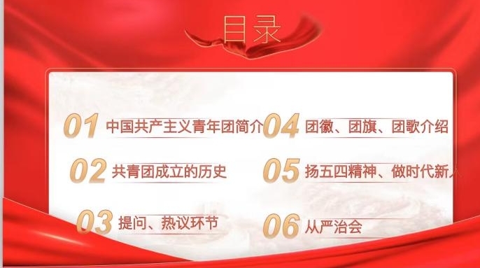 本次活动由中国共产主义青年团简介、团徽、团旗、团歌介绍、共青团成立的历史、扬五四精神、做时代新人等六个部分组成。在活动中,共青团员们一起走近共青团,献礼建团百年。